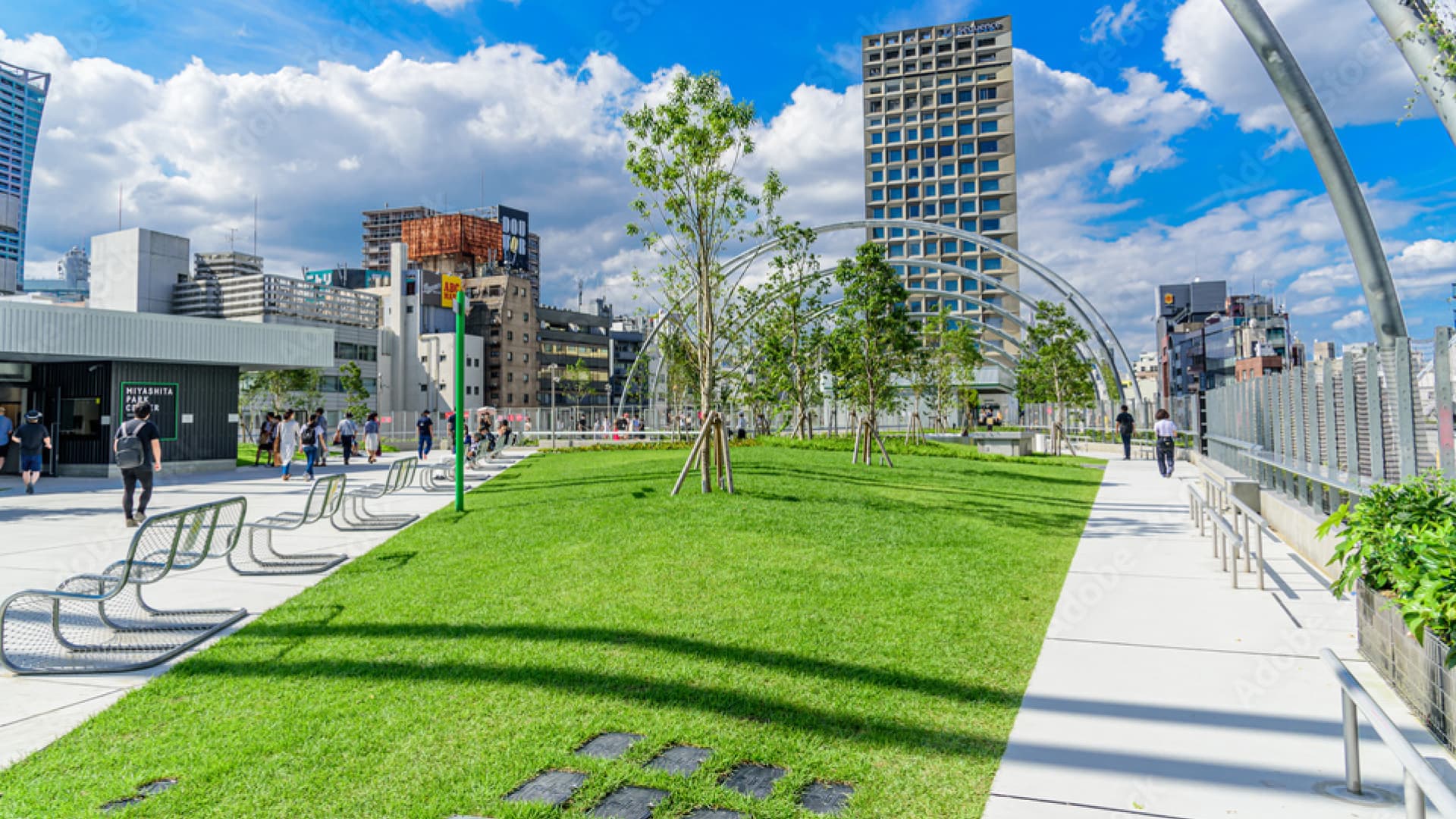This 4-story low-rise complex reopened in 2020 from Miyashita Park. Located between Meiji-dori Avenue and the JR railroad tracks, it features a distinctive arched canopy that integrates the park, commercial facilities, and a hotel.