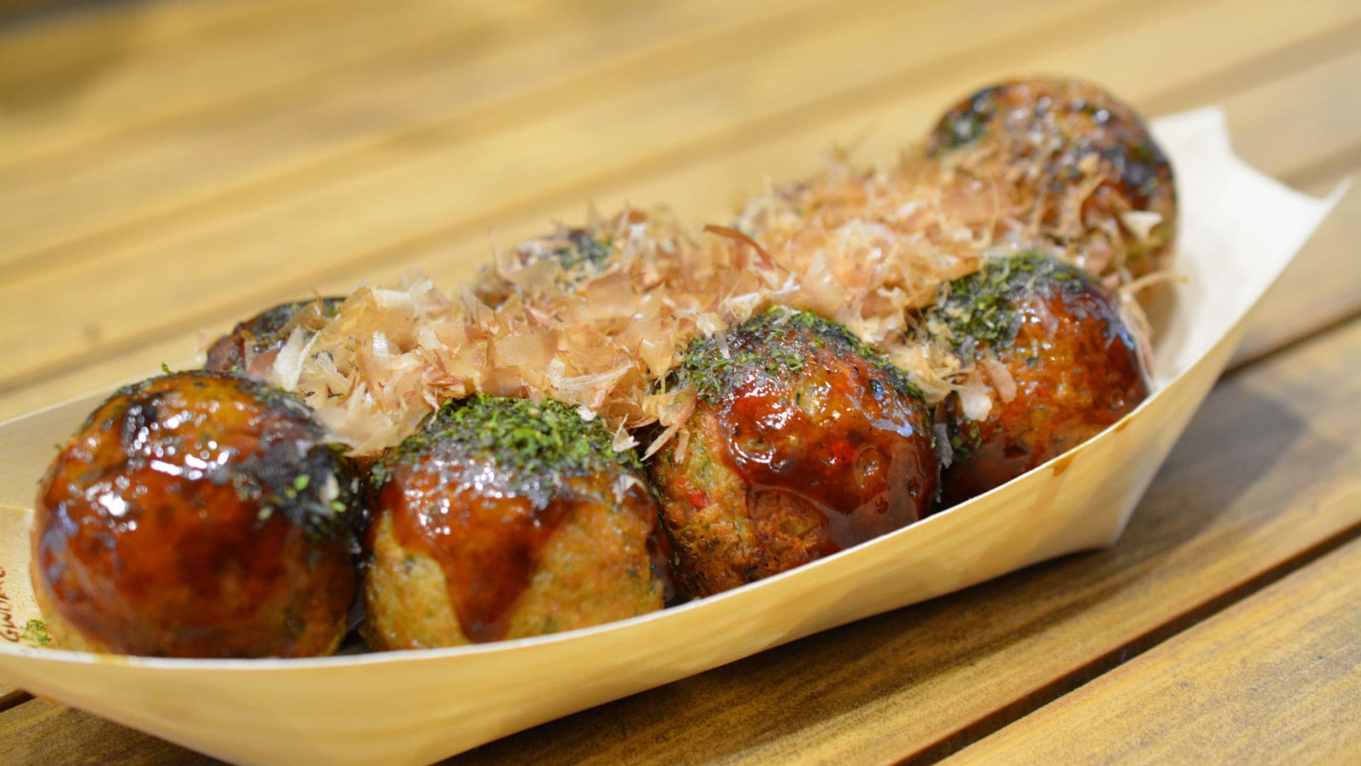 Takoyaki is a signature dish from Osaka - octopus dumplings made from wheat flour batter, cooked in a special molded pan to create balls that are crispy outside and creamy inside. They're typically topped with sauce, dried seaweed, bonito flakes, and mayonnaise.