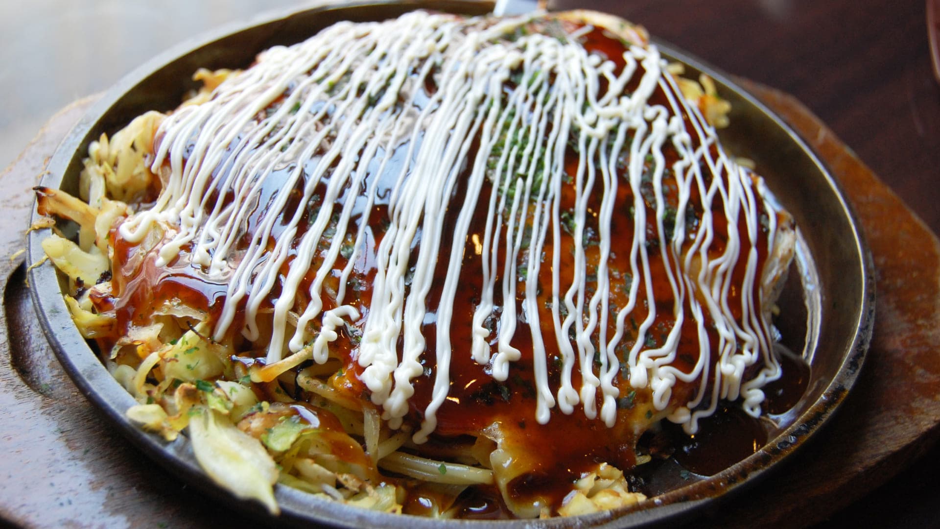 Okonomiyaki is a Japanese dish made from wheat flour batter mixed with shredded cabbage, meat, and eggs. It's especially famous in Osaka and Hiroshima, where it has evolved into distinct regional specialties.