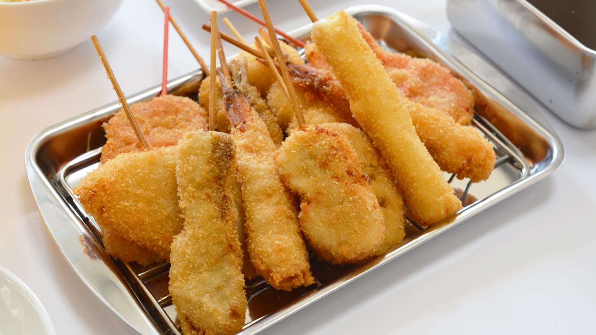 Kushiage, originating from Osaka, is a dish of bite-sized meat, seafood, and vegetables skewered, coated in breadcrumbs, and deep-fried to crispy perfection. The variety of ingredients is extensive, including shrimp, asparagus, beef, and quail eggs. It's typically eaten with sauce (Important note: each table gets its own sauce, and double-dipping is strictly forbidden!)