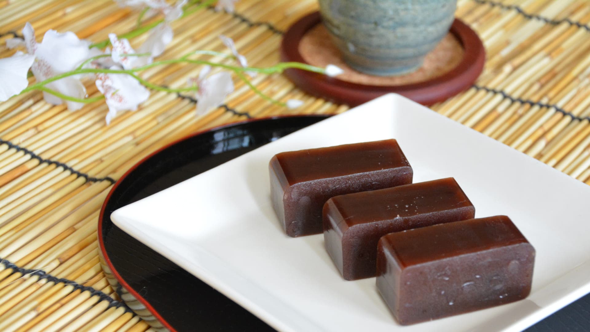Yōkan is a traditional Japanese confection made from sweet bean paste and agar, known for its moist, firm texture. An essential sweet in tea ceremonies, its clean-cut appearance and glossy surface embody Japanese aesthetics.